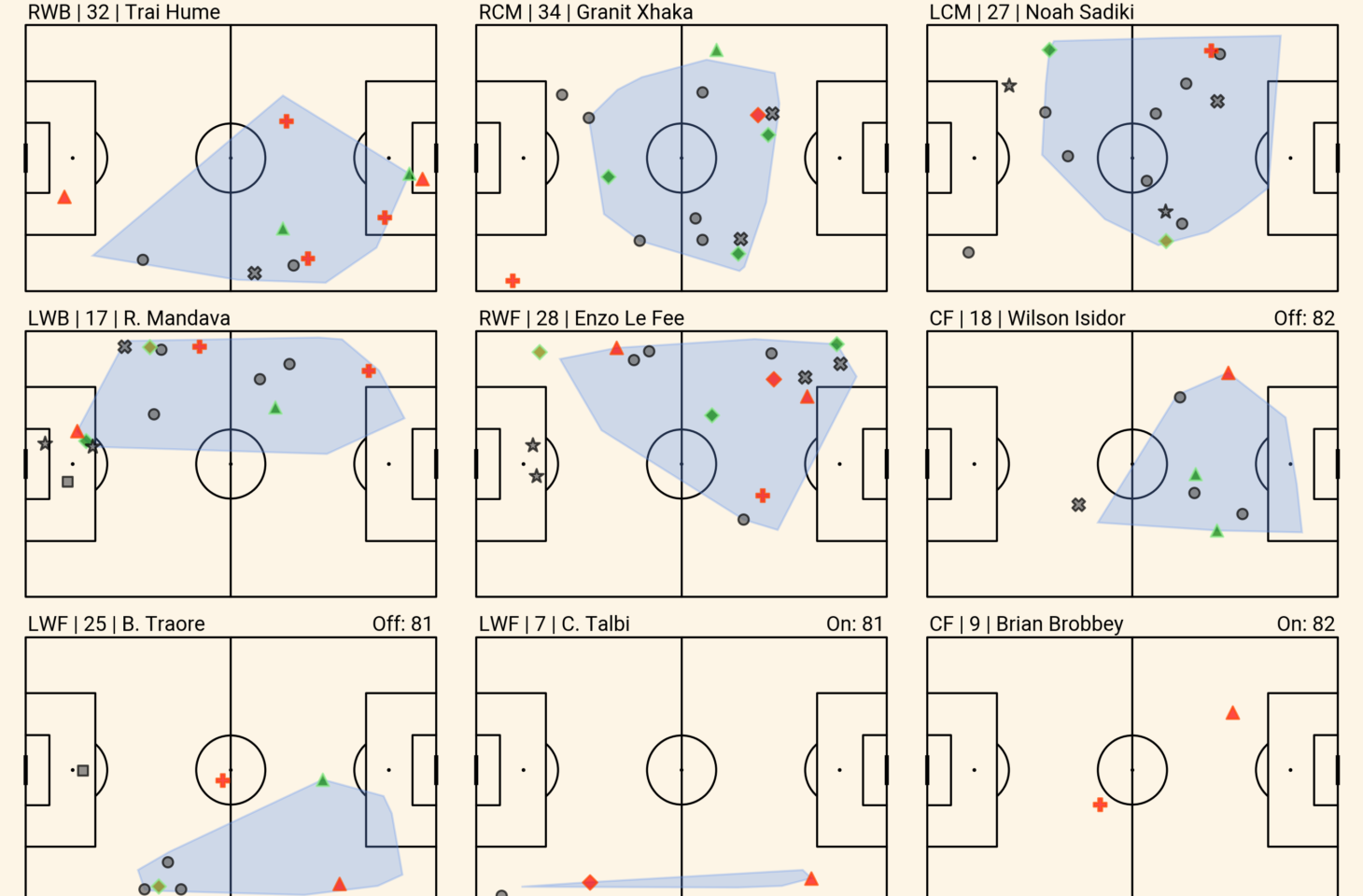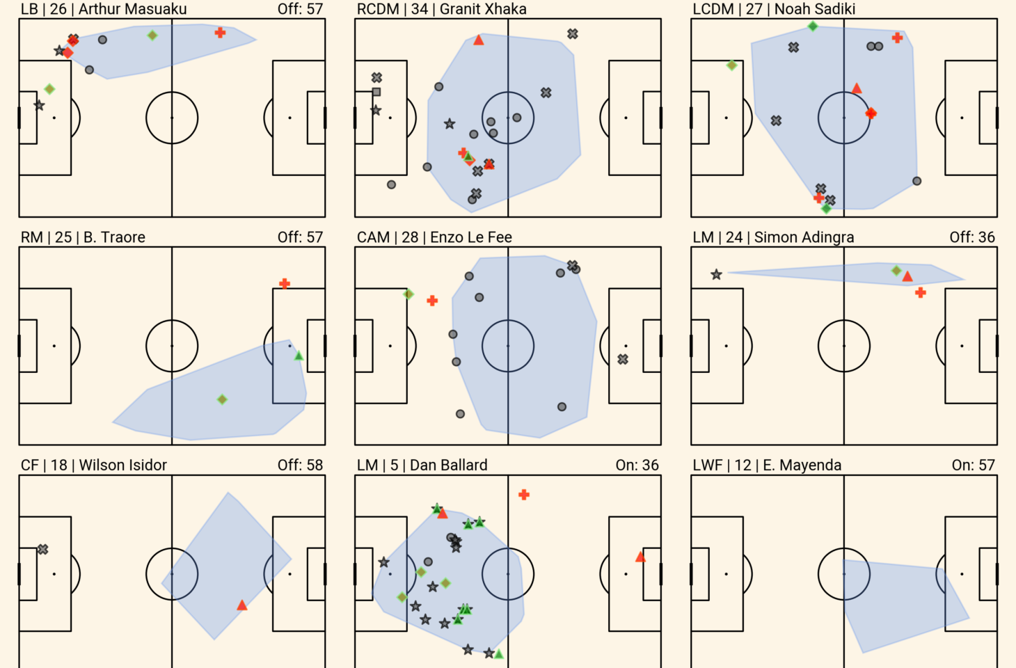 Since his reintroduction, he’s picked up just a pair of goal involvements — a penalty and a lay-off for Xhaka’s equaliser against Everton — but his overall pace of play, ball-carrying and creativity have impressed just as we all expected. He has the most touches in the attacking third, the most through balls, joint-most goal-creating actions and second-most shot-creating actions (the latter two both alongside Xhaka).